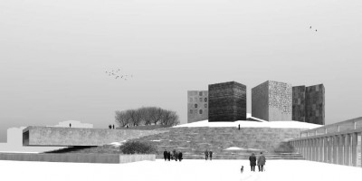 Музей обороны и блокады Ленинграда на Смольной набережной будет построен по проекту мастерской «Студия 44» Никиты Явейна. Работа представляет собой несколько прямоугольных объемов на высоком холме.