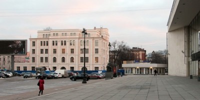 На Греческой площади сносят временное здание касс БКЗ «Октябрьский». Их построили на период строительства бизнес-центра, вставшего на месте прежних касс.