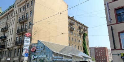 Здание-стекляшка стоит в лакуне между домами 130 и 138 по Лиговскому проспекту. Оно было построено в российское время, предположительно в начале 2000-х. В нем работали разные точки, в последнее время — цветочный магазин.
