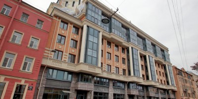 Верхние этажи, торчащие над кровельным фронтом, сделаны в виде «аквариума». Вогнутую поверхность дополнили мозаикой с предсказуемым открыточным видом Петербурга, но фантастическим: Петропавловский собор выполнен в ракурсе со Стрелки Васильевского острова, но при этом слева от него добавлен Исаакий.