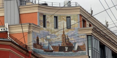 Завершилось строительство жилого дома на Большой Зелениной улице, 34, верхнюю торчащую часть которого дополнили мозаикой. Здание разместили на месте сталинского СТО по ремонту «запорожцев».
