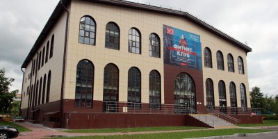 Спортклуб представляет собой двухэтажную коробку с окнами, скругленными кверху. Фасады облицованы керамогранитом коричневых тонов.