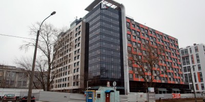 Проект делало ООО «Студия „М4“». Это 12-этажная коробка с фасадами, раскрашенными разноцветной плиткой. Центром композиции стал профиль, прорезающий здание снизу вверх и завершающийся козырьком в виде загнутого листа бумаги.