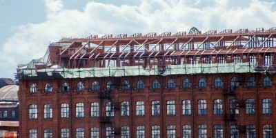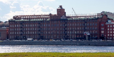 Зданию Невской бумагопрядильной мануфактуры на Синопской набережной строят двухэтажную мансарду. Судя по внешнему облику конструкций, она будет соответствовать историческим габаритам.