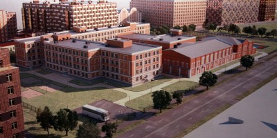 Три исторических фасада действительно воссоздаются, а позади строится новая четырехэтажка; между воссозданным и новым корпусами оборудуют два перехода в уровне второго этажа. Главный вход собираются организовать с запада через новый корпус. Еще один вход сделают с северного фасада — в секцию, где создадут начальную школу.