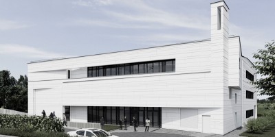 Здание будет выполнено в виде белой коробки с активной пластикой фасадов: косыми нишами, «эркером», рустовкой с протяженной «кладкой», а также ленточным остеклением.