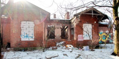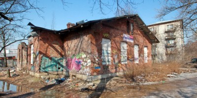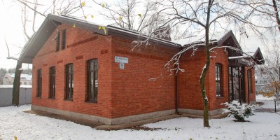 Одноэтажное здание в «кирпичном» стиле на Фермском шоссе, 36, литера В, было возведено до революции, скорее всего, в начале XX века. Каково было его первоначальное функциональное назначение, неясно. Возможно, постройка входила в состав больницы святого Пантелеймона. В советское время здесь была библиотека. Многие годы постройка пустовала, горела и постепенно превратилась в руины. Памятником она не числилась и никакой государственной охраны не имела.